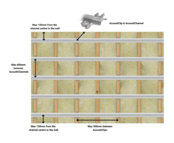- Maximum 900mm centres between AcoustiClips along the AcoustiChannel