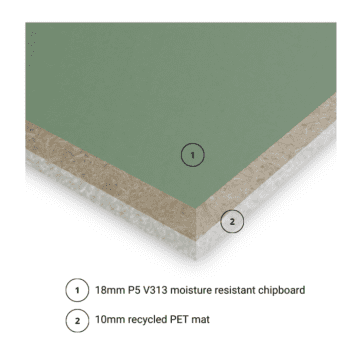 Noisedeck 28 is an interlocking floating floor system. It is made from a twice-recycled PET mat laminated to P5 PEFC and FSC-certified tongue and groove chipboard. The boards consist of PEFC and FSC-certified chipboard with a heat-treated green top surface finish, bonded to a 10mm PET mat that is 100% twice recycled.