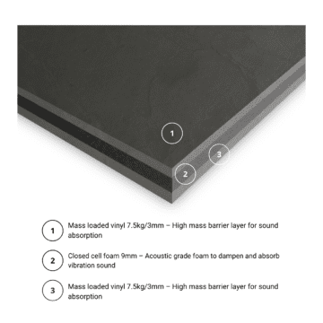 - 3mm Mass-loaded vinyl 7.5kg/m² – High mass barrier layer for sound absorption.