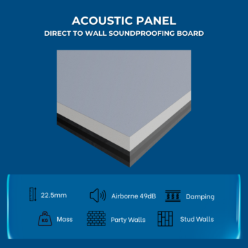 Noisestop Acoustic Panel is our slimmest standalone wall soundproofing panel, reducing noise from neighbours or improving room privacy. The 22.5mm Noisestop Acoustic Panel delivers up to 49dB of airborne noise reduction, making it ideal for sound-insulating party walls and stud walls. A four-layered soundproof panel optimises sound insulation without compromising living space. Noisestop Acoustic Panel is one of the slimmest direct-to-wall panels designed for soundproofing against neighbour noise and noise reduction for internal stud walls. The Acoustic Panel provides mass and sound absorption when applied to walls, which reduces the transmission of airborne sound. Restore quiet in your home with our slimmest direct-to-wall soundproofing board.